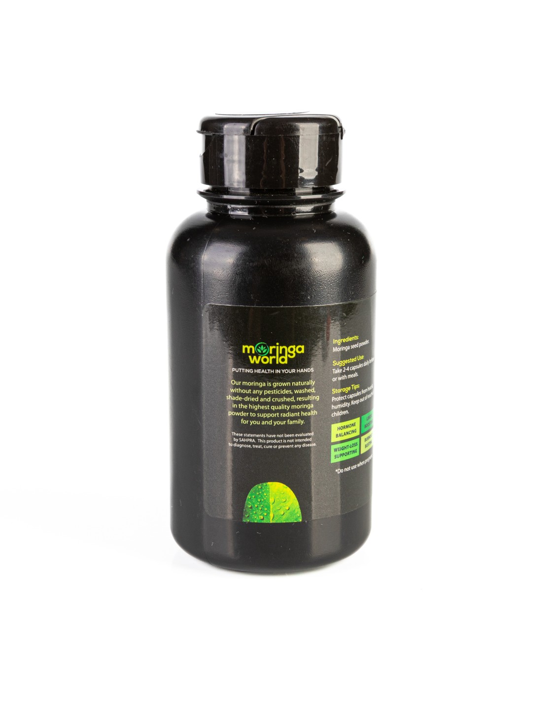 One month's supply of pure moringa seed powder capsules which supports hormone balancing and aids the improvement of sexual health and vitality in men and women.